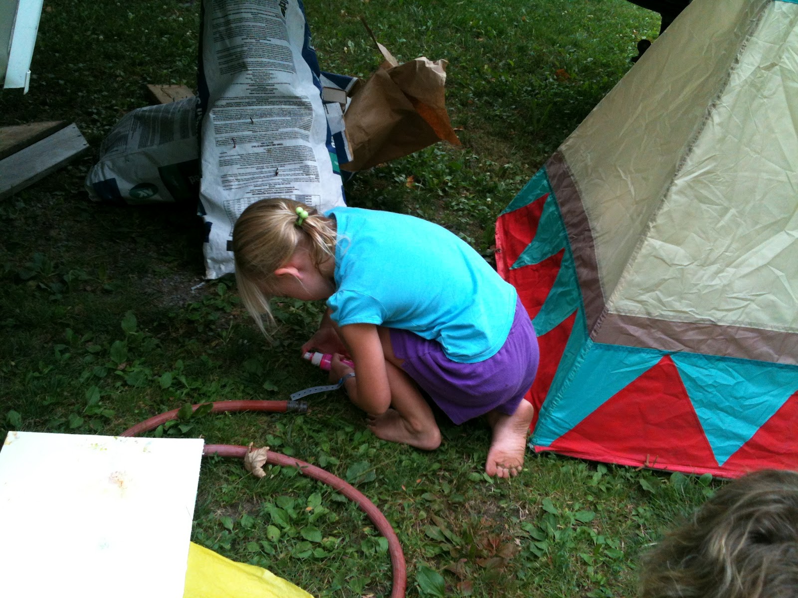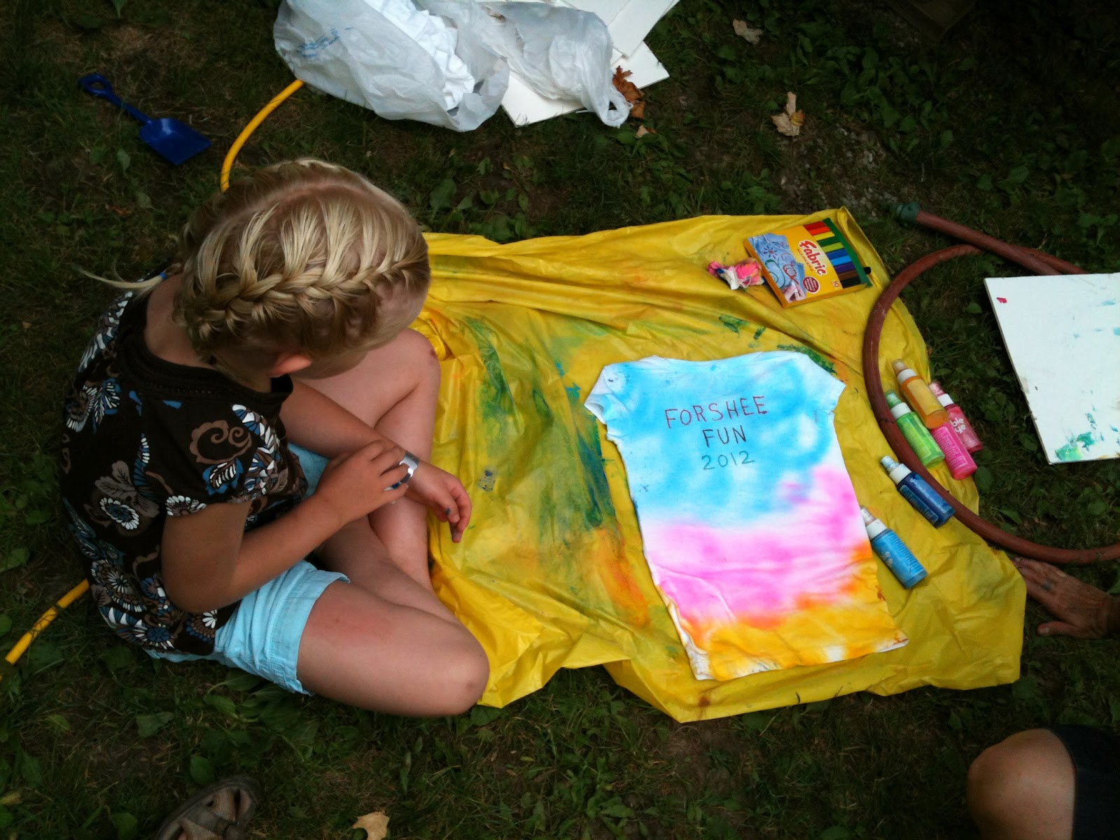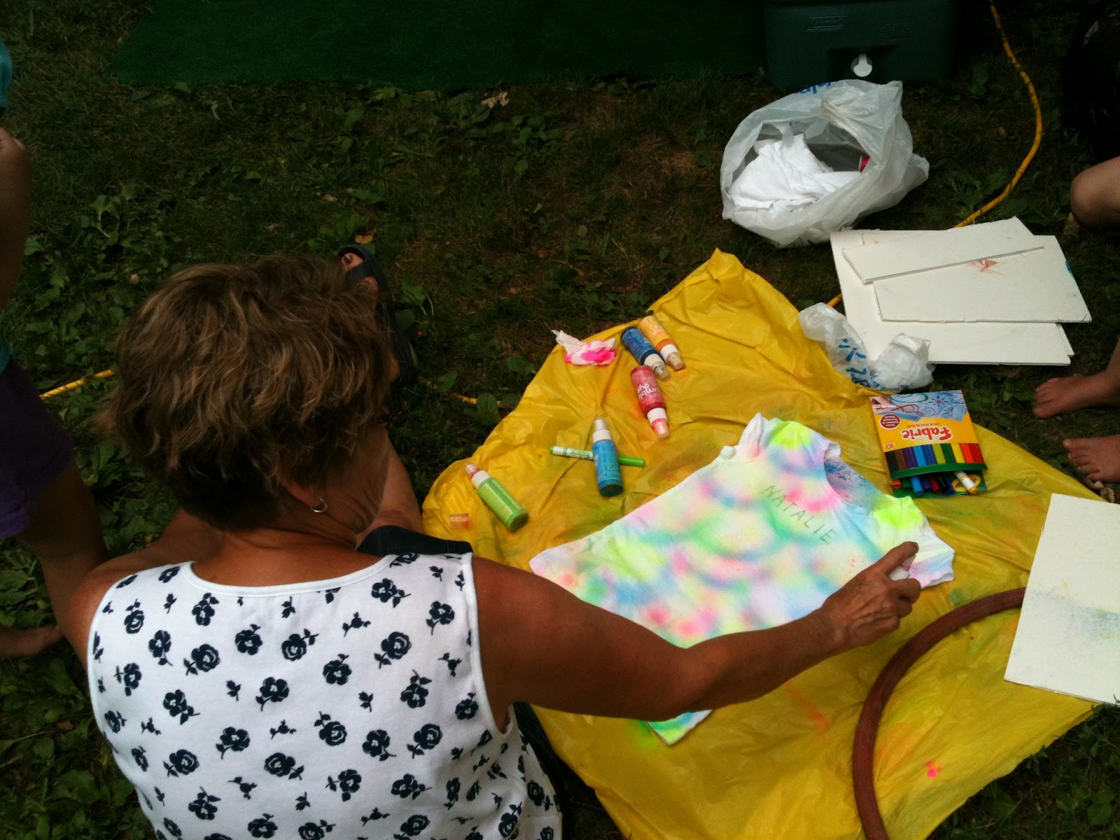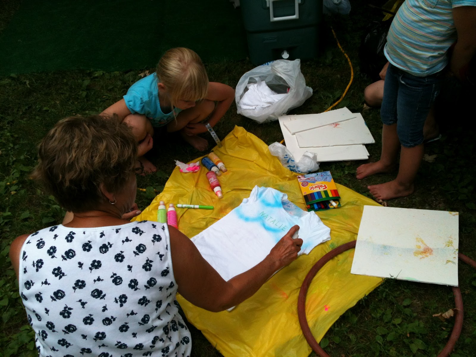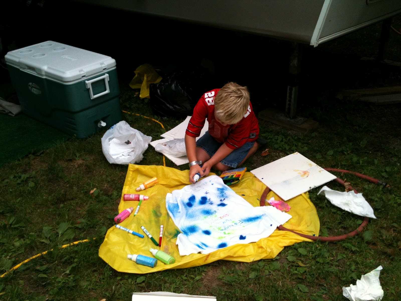 Camping is great, but having activities planned when you have 9 children (3 are mine :) under the age of 8 is an absolute must!! Grandma pulled through again. She had the idea to create tie-dye T-Shirts without the hassle of actually using tie-dye! This is a finished product. These shirts are great for family reunions, too.